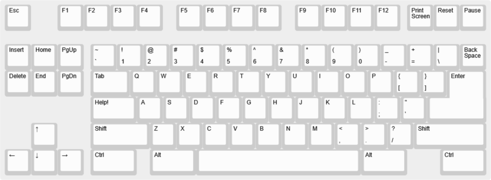 the key between tab and shift is labeled "help" and is used instead of F1 to pull up onscreen help.