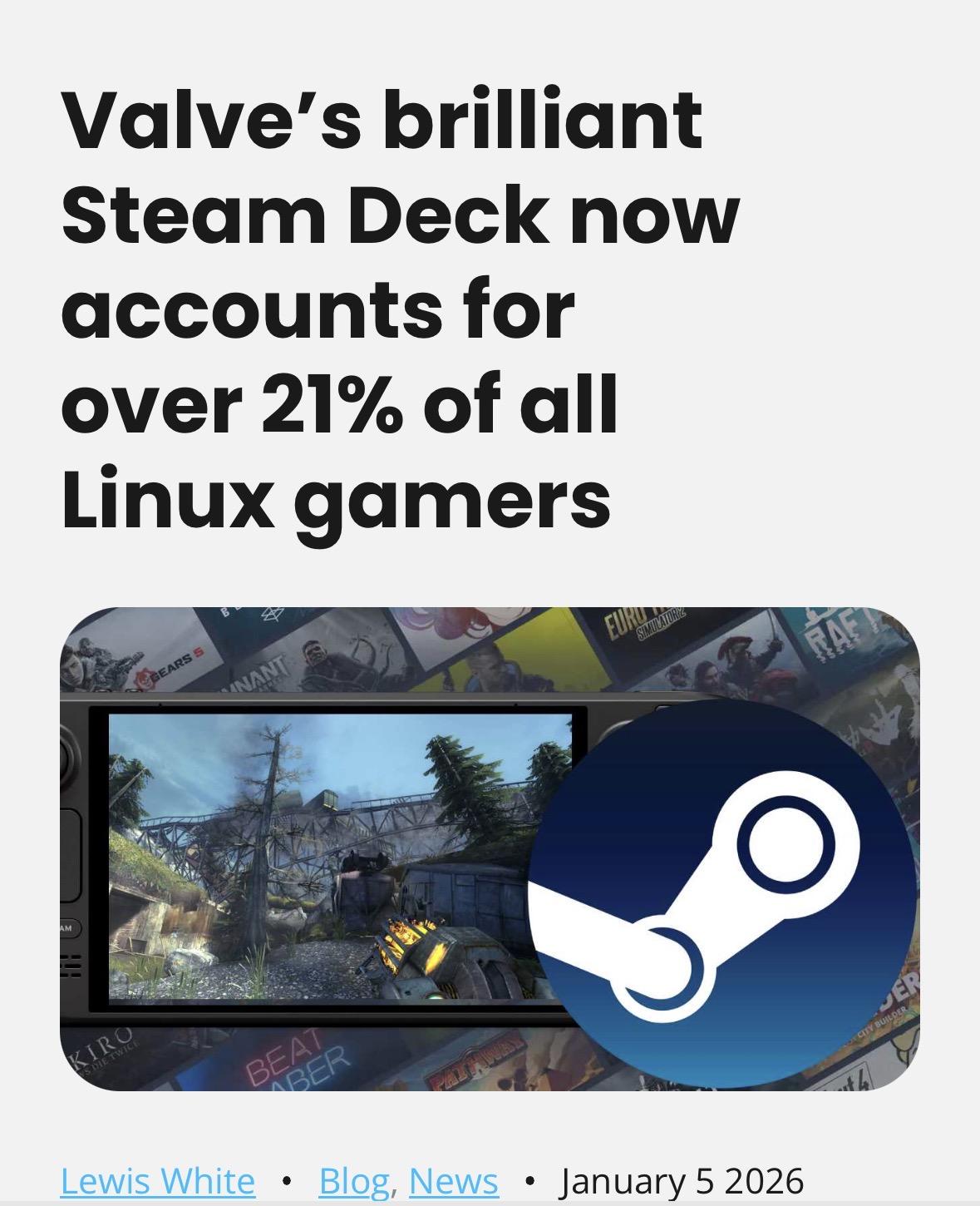 Valve is building themselves another blue ocean of potential by fixing a service problem that is usually the big barrier for gaming in Linux. I hope the Steam machines do well too. https://frvr.com/blog/news/valves-brilliant-steam-deck-now-accounts-for-over-21-percent-of-all-linux-gamers/
