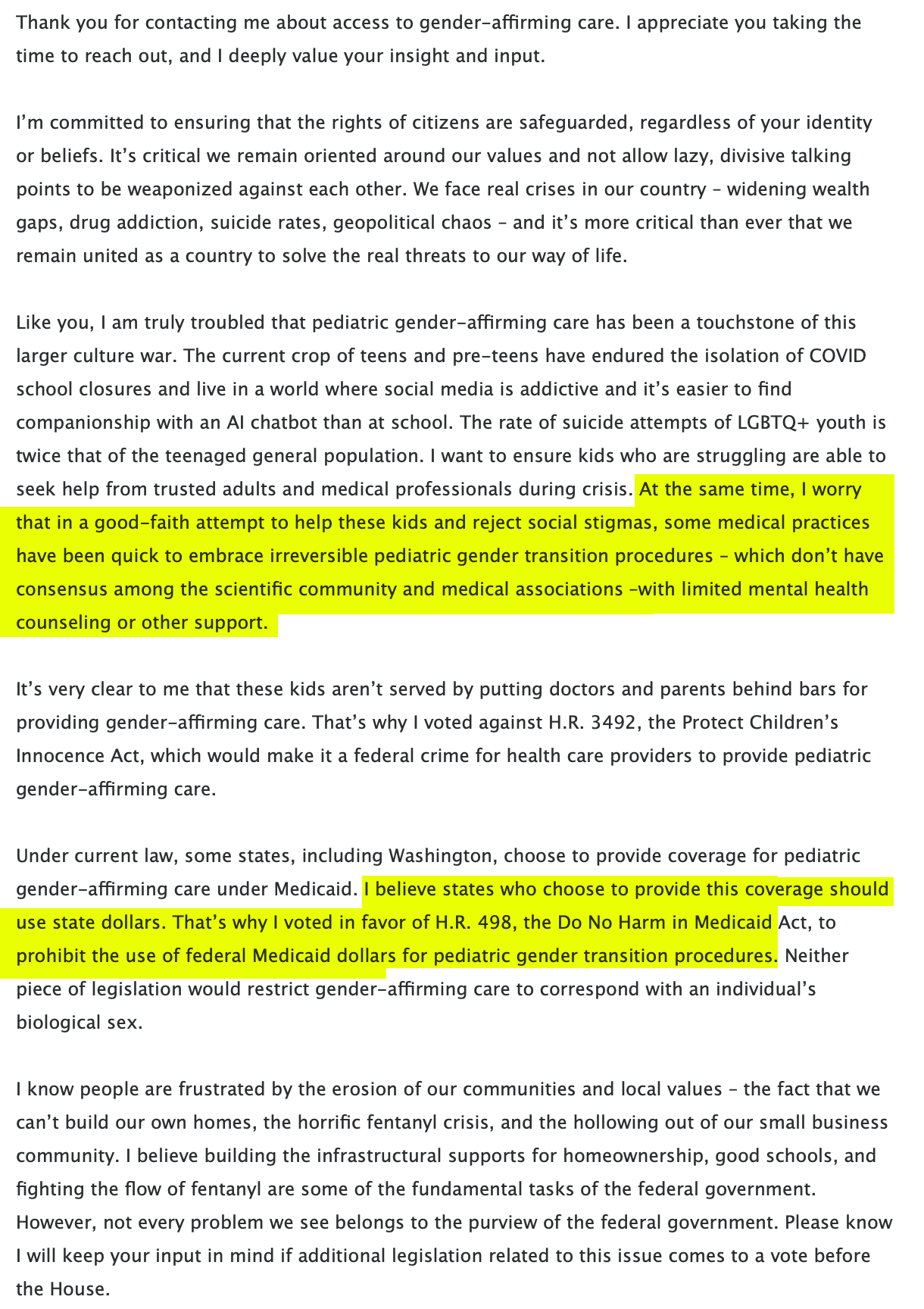 Hey y'all, Washington Rep. Marie Gluesenkamp-Perez voted for a bill that would restrict gender-affirming care for youths. https://www.advocate.com/politics/medicaid-gender-affirming-care-bill