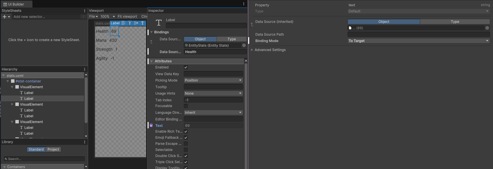 ui toolkit uses this concept for data binding. so, since we already have an entity stat sheet, lets bind it to some ui and display it. we can write the uxml directly which kind of sucks, but thankfully there’s also a graphical editor we can use